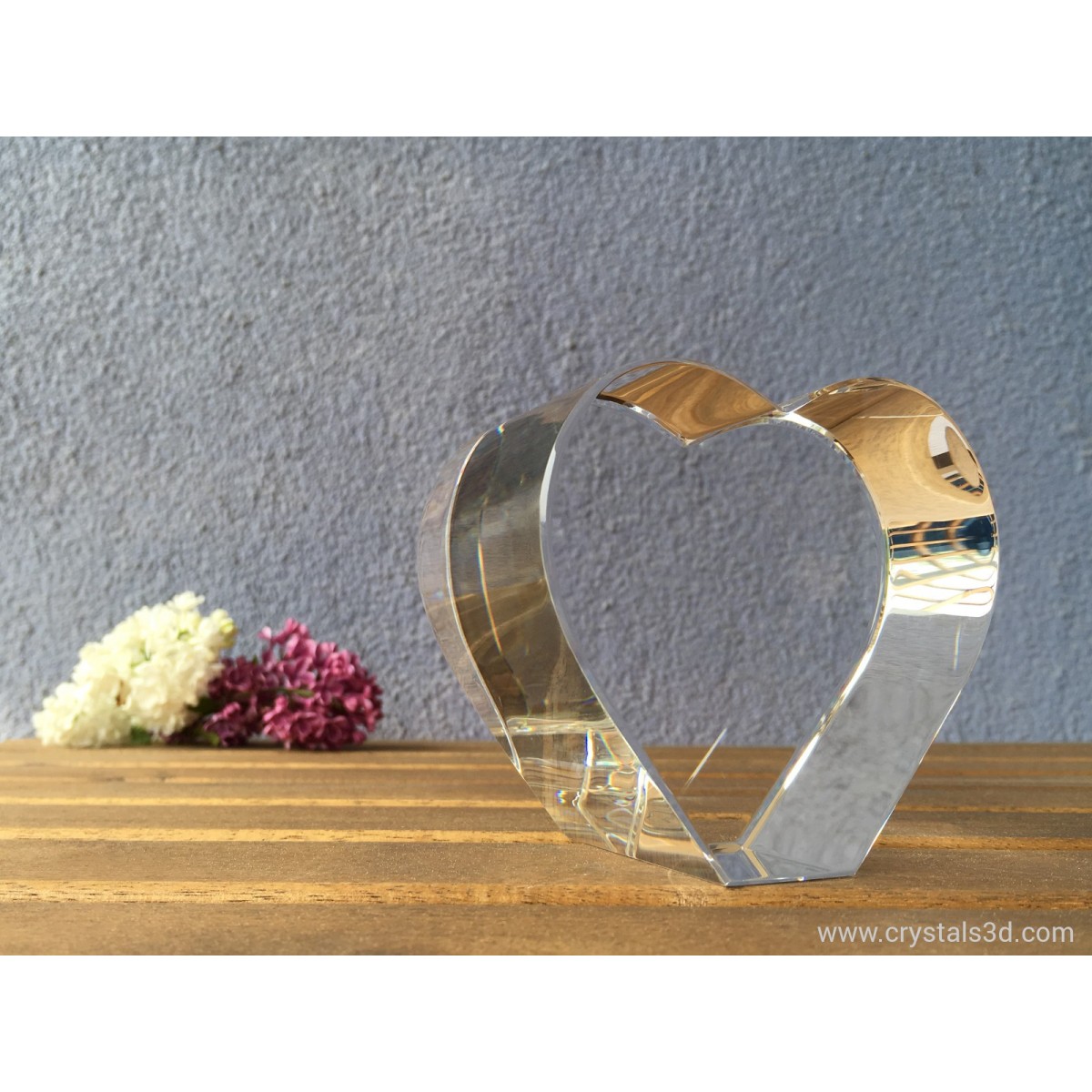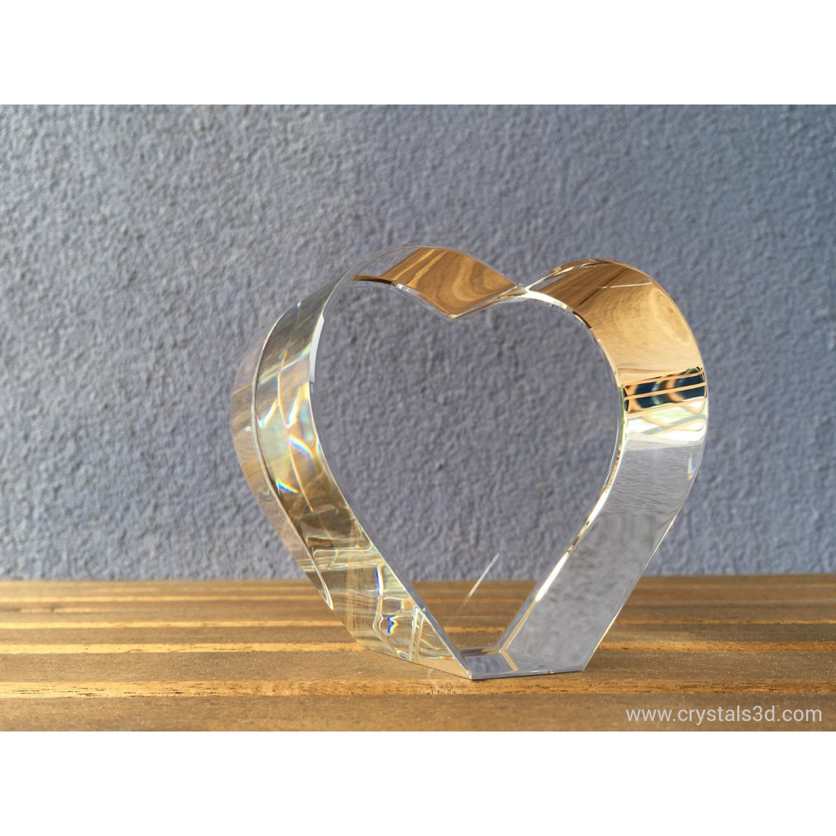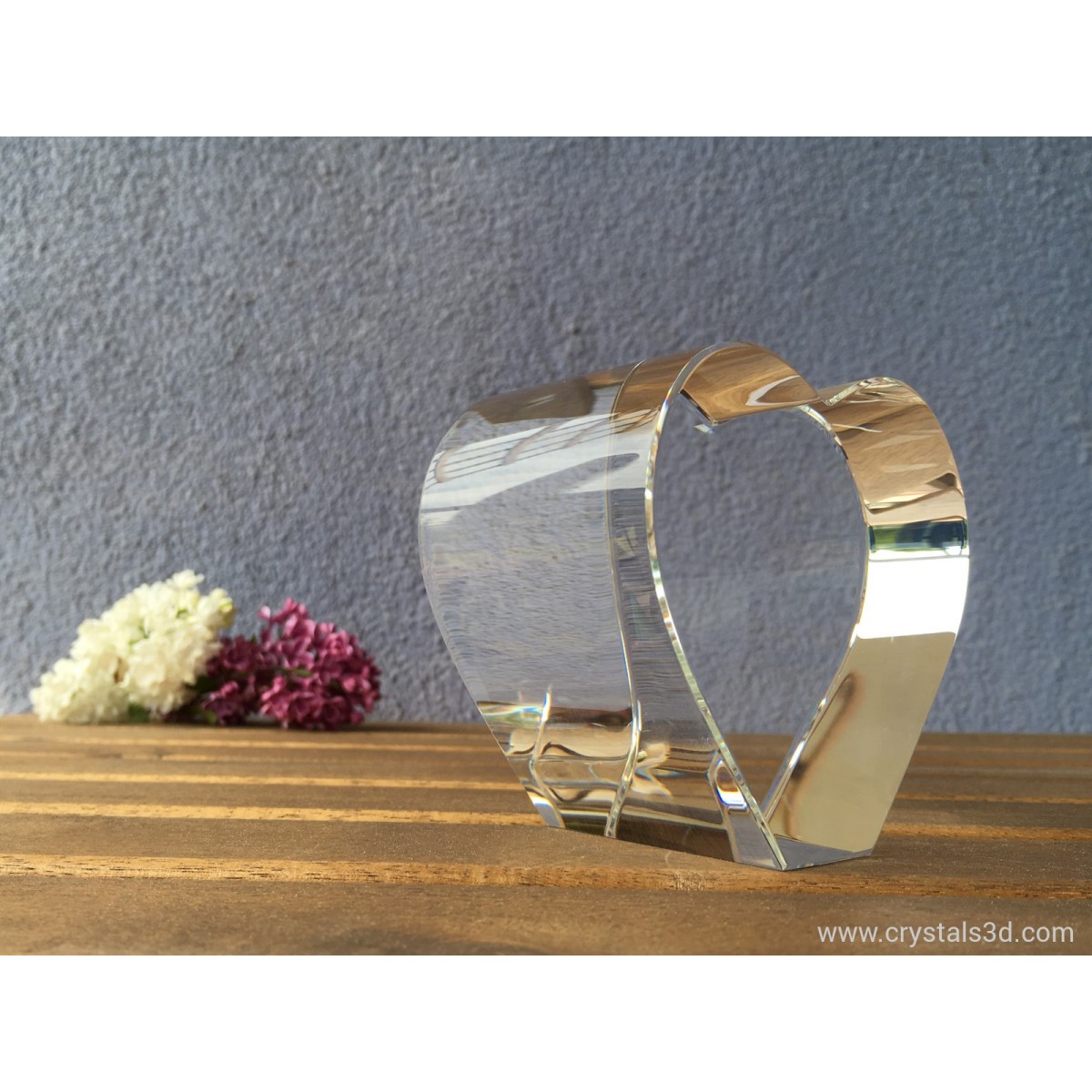 A crystal heart, thick enough for 3D pictures and ornaments, with personalised project.