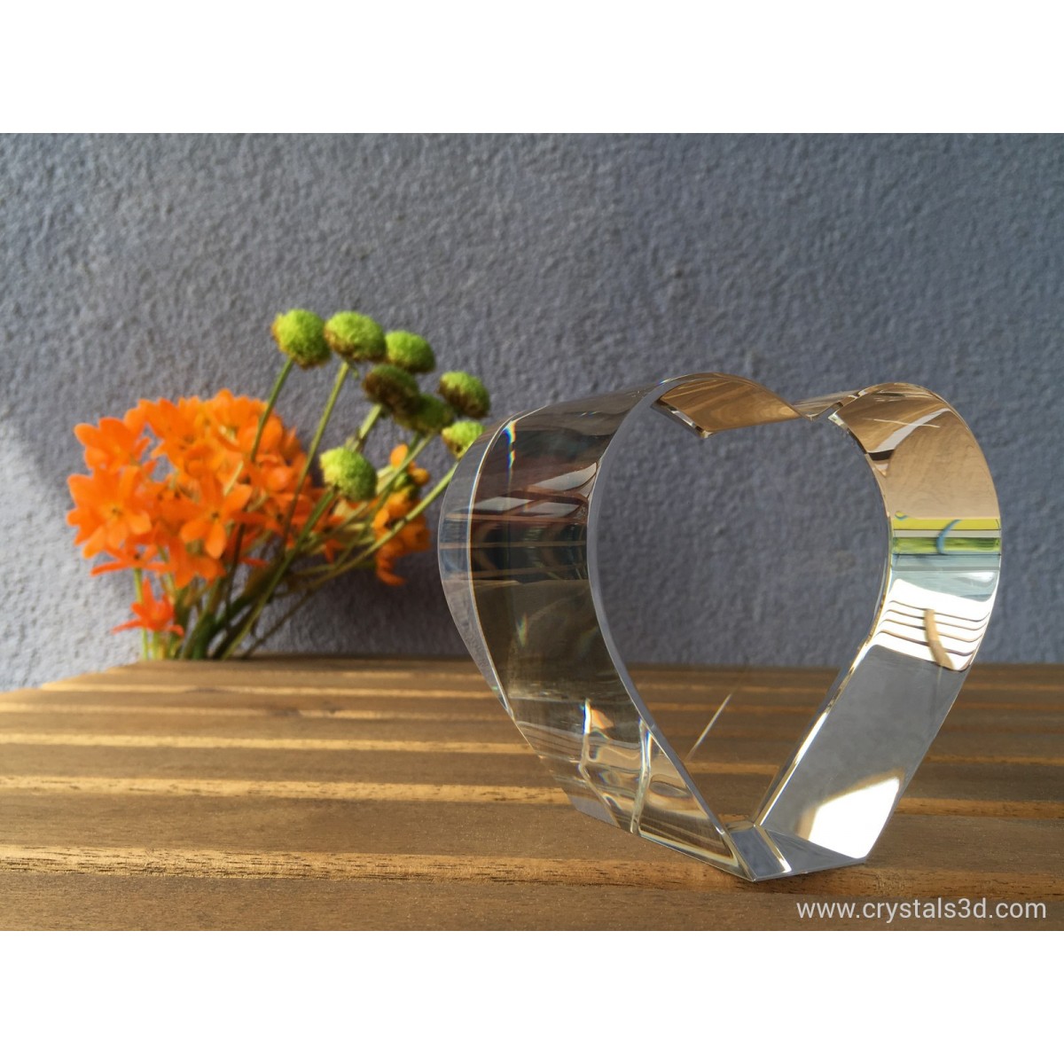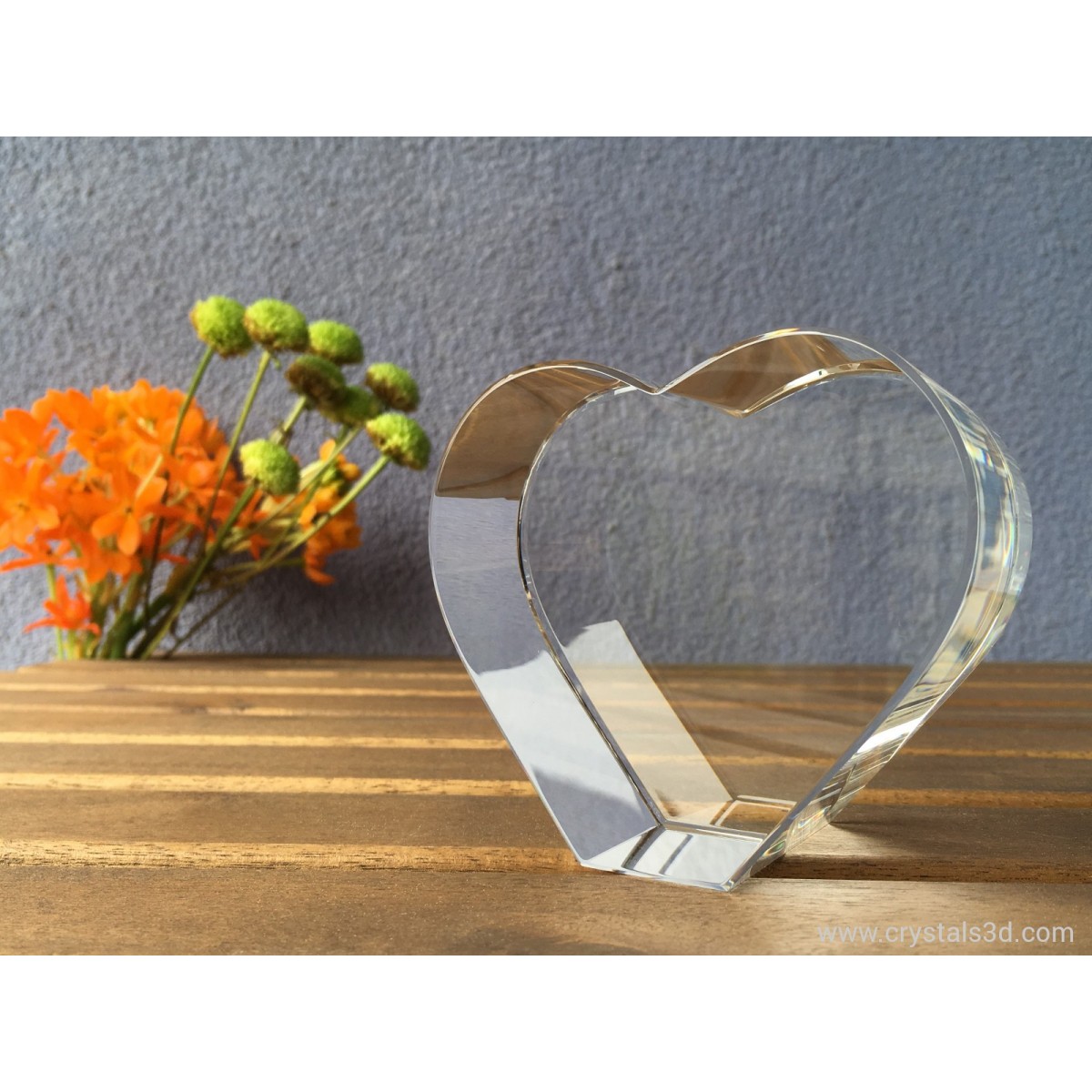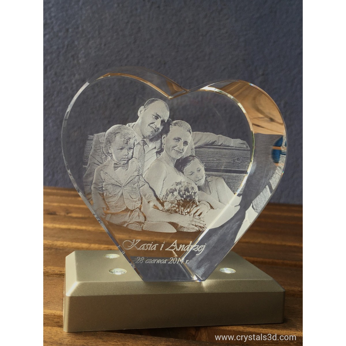 A crystal heart, thick enough for 3D pictures and ornaments, with personalised project.