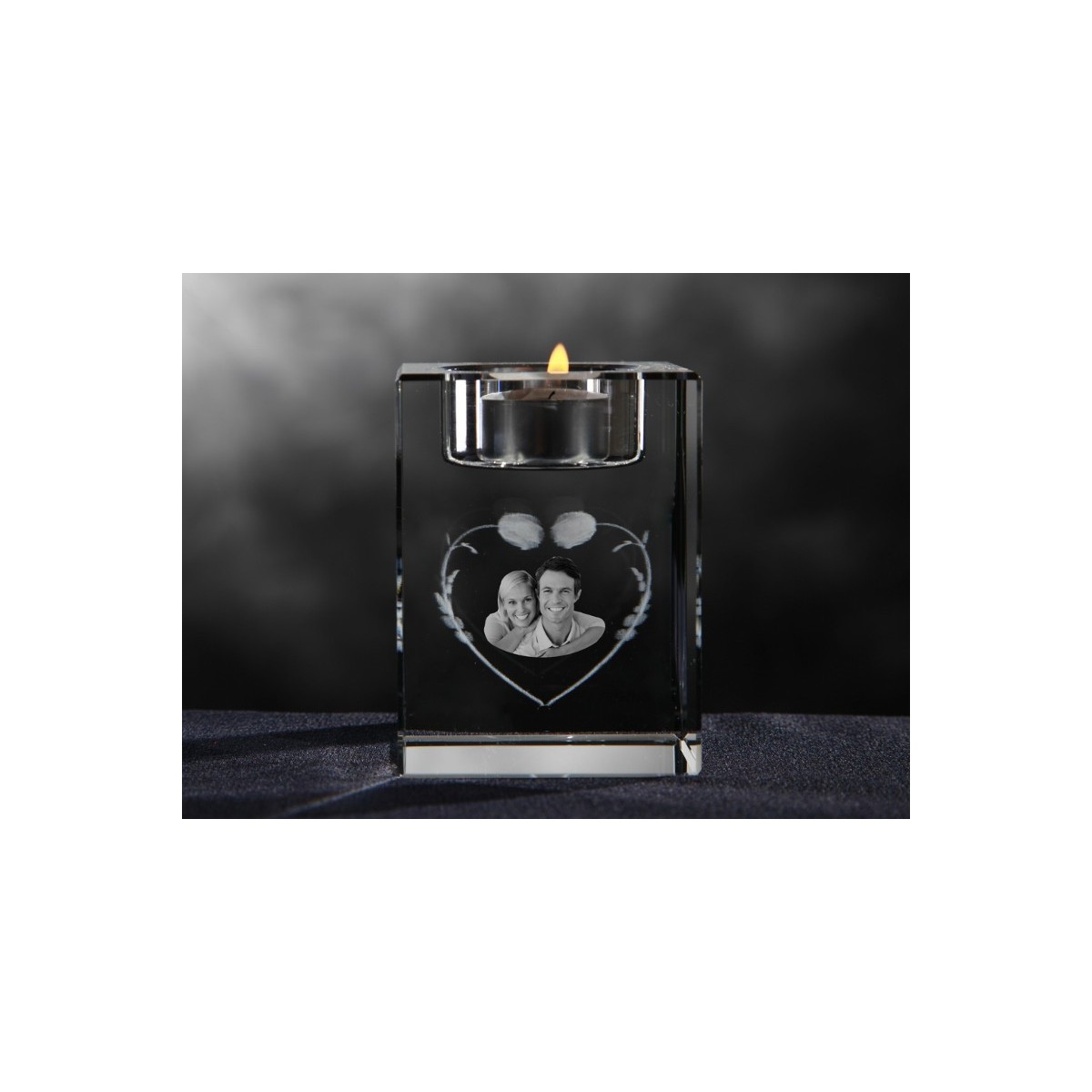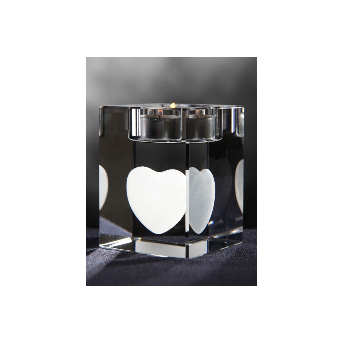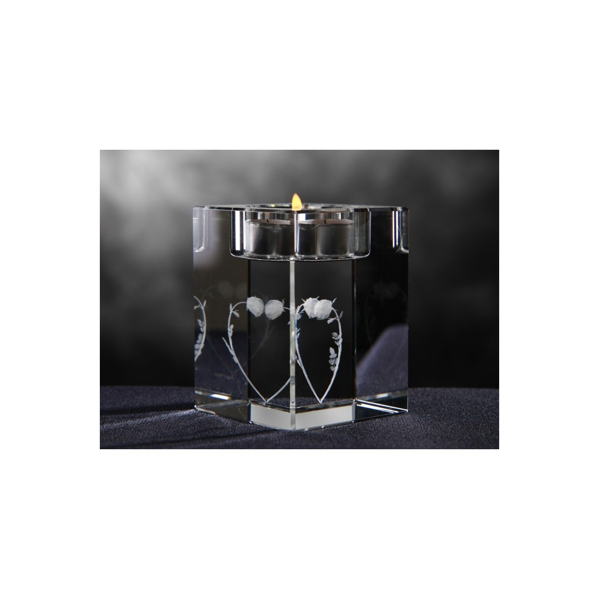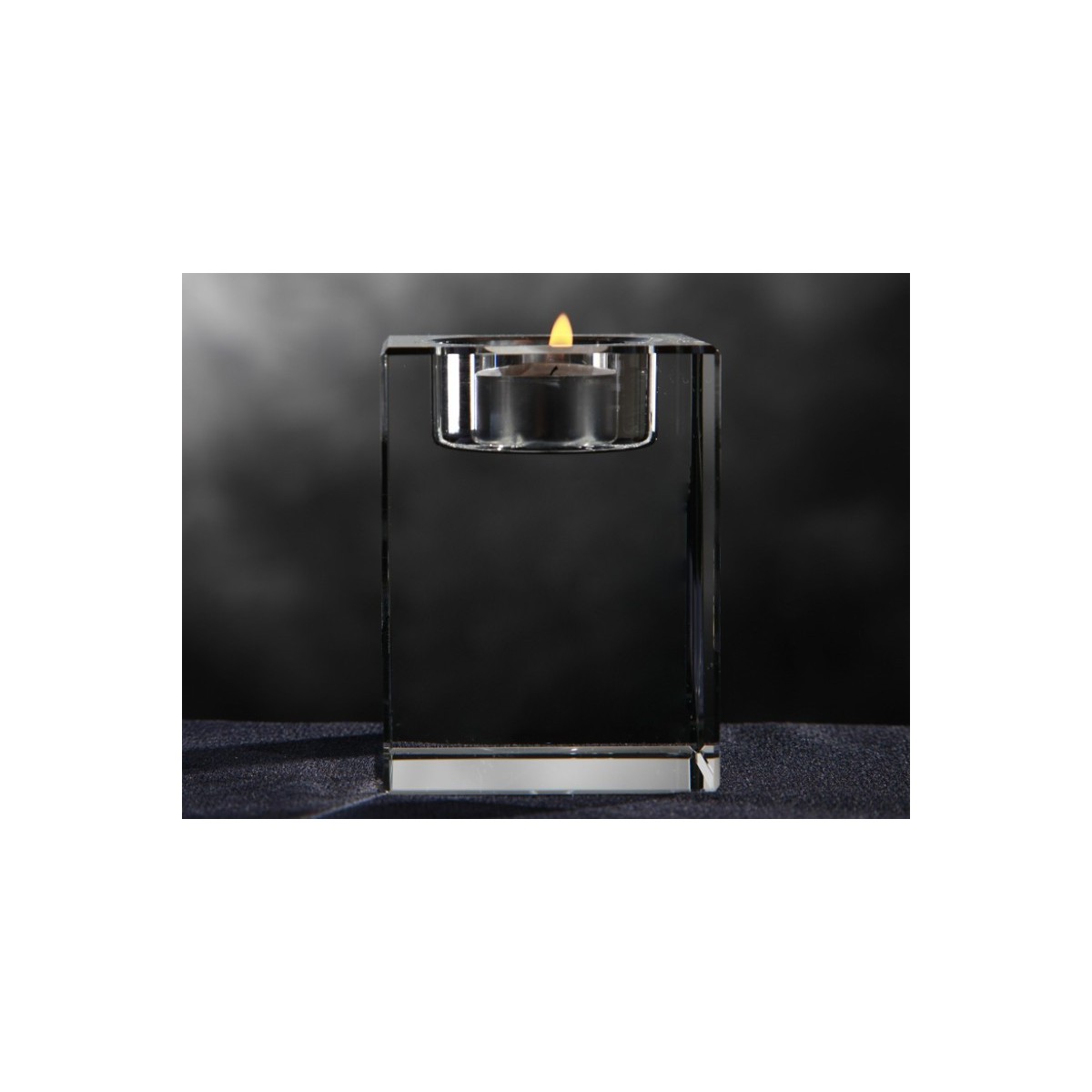A crystal candleholder (6*6*8 cm = 2.4*2.4*3.1"), personalised with a 2D or 3D project.