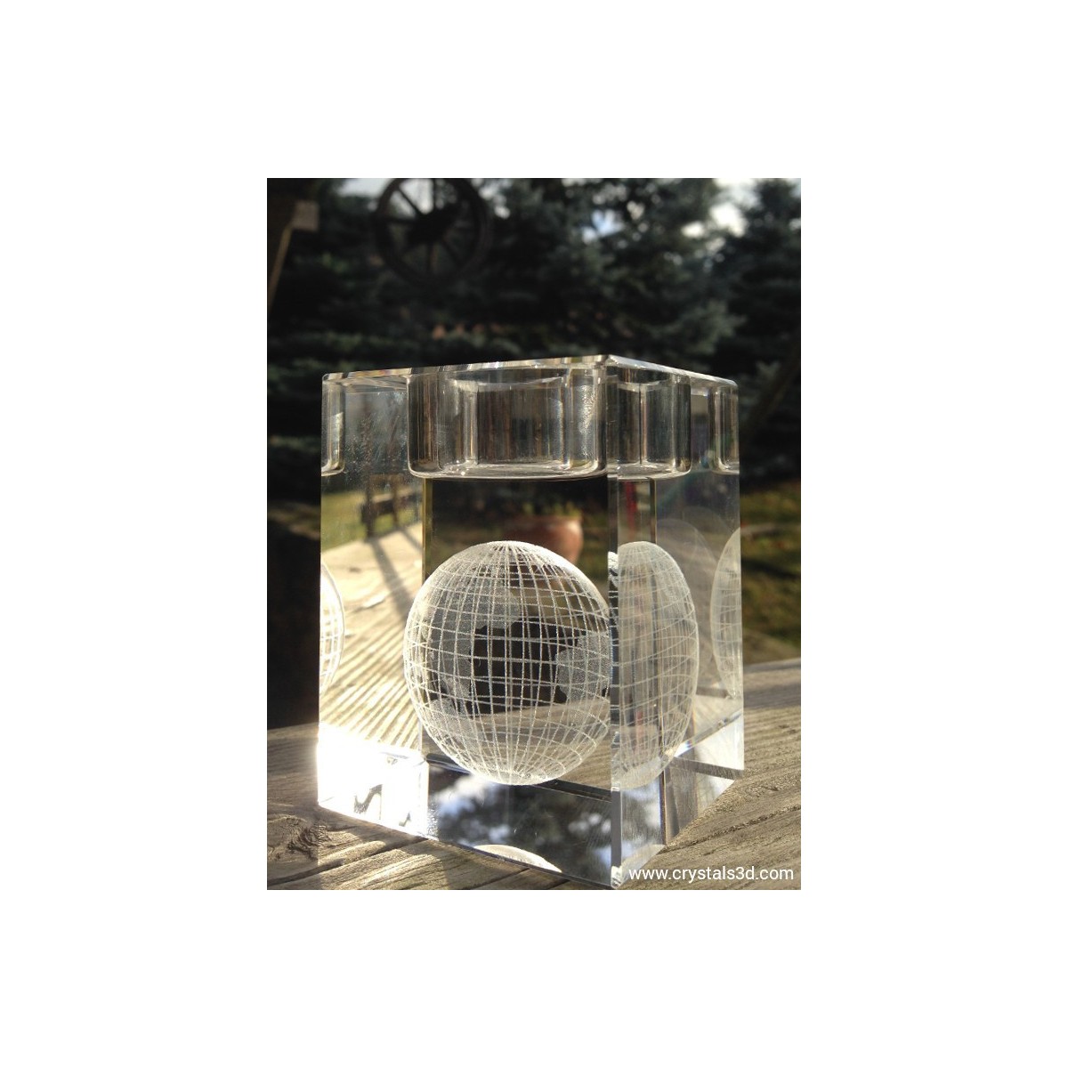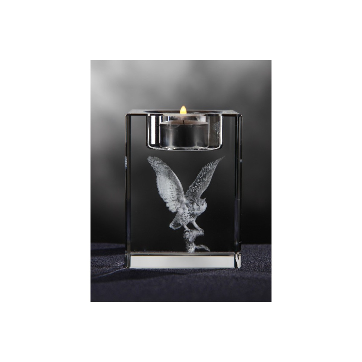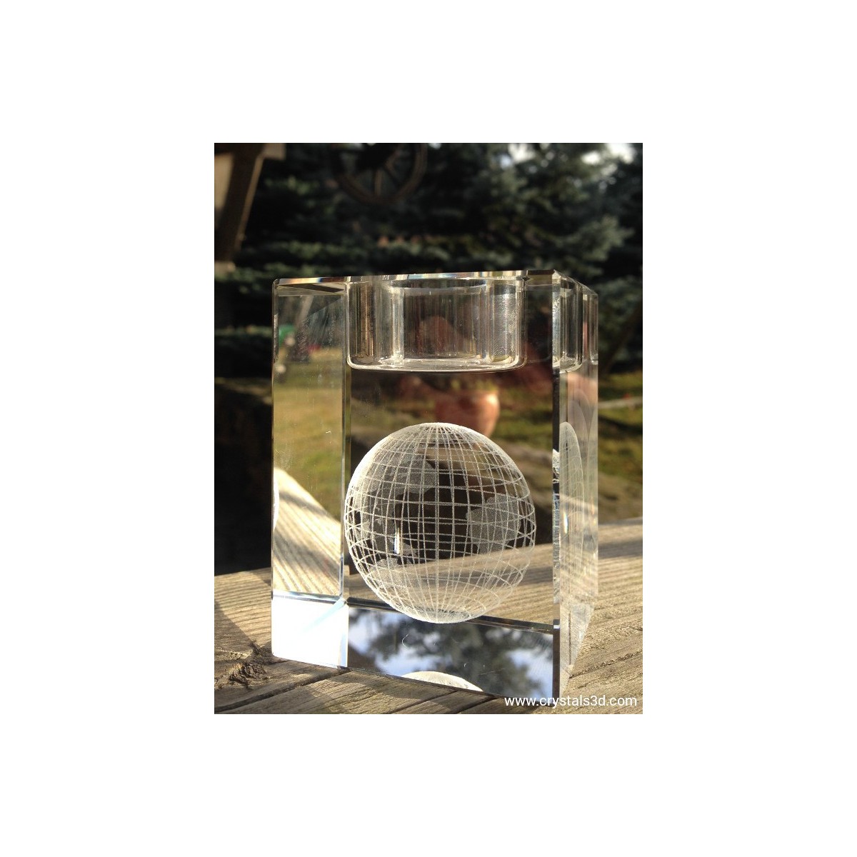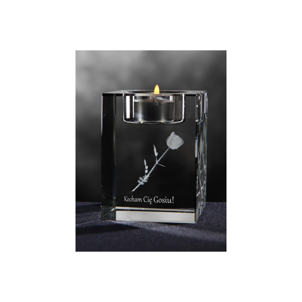 A crystal candleholder (6*6*8 cm = 2.4*2.4*3.1"), personalised with a 2D or 3D project.
