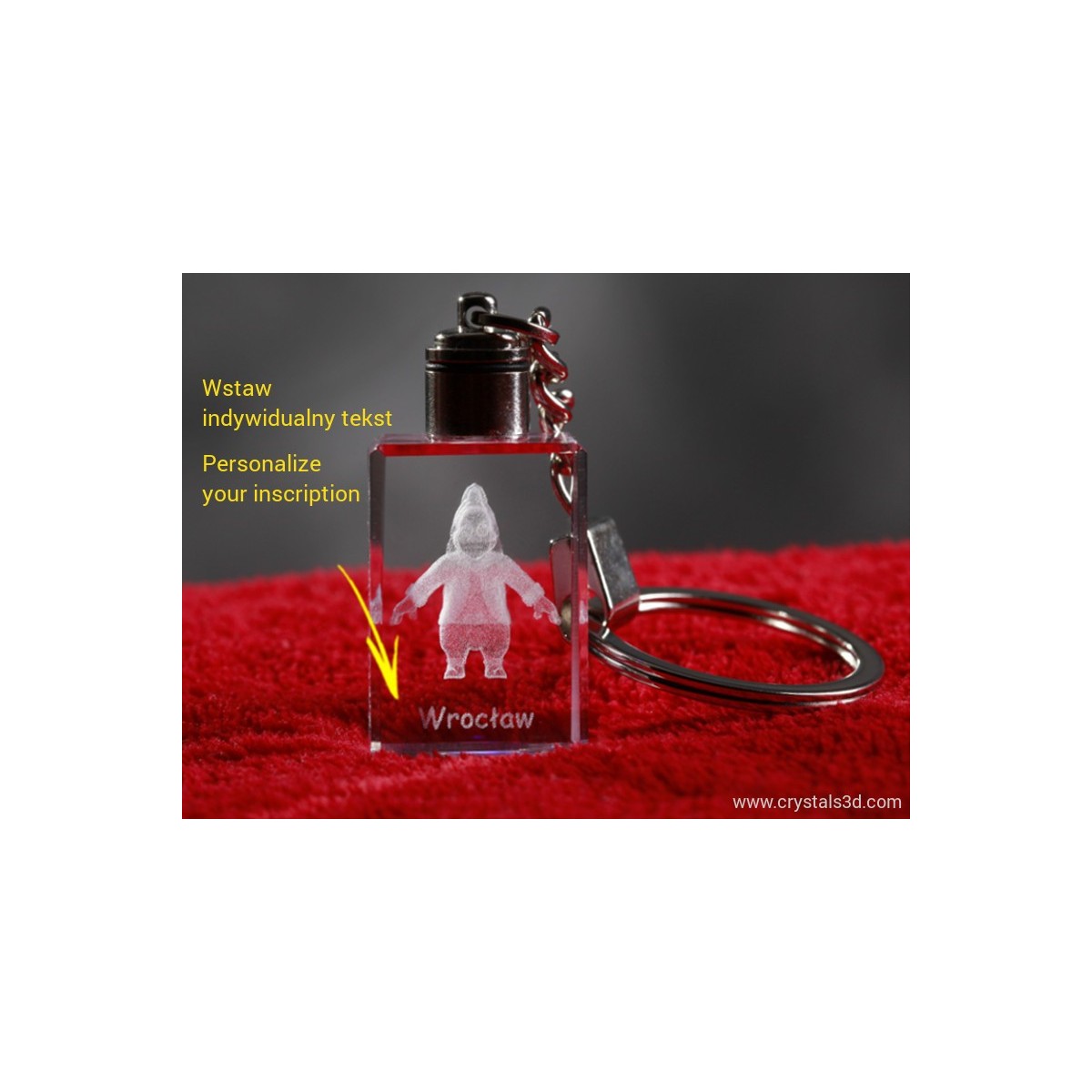Brelok do kluczy z kryształu, wymiary 2*3*1.5 cm z krasnoludkiem 3D, który jest m.in. symbolem Wrocławia.