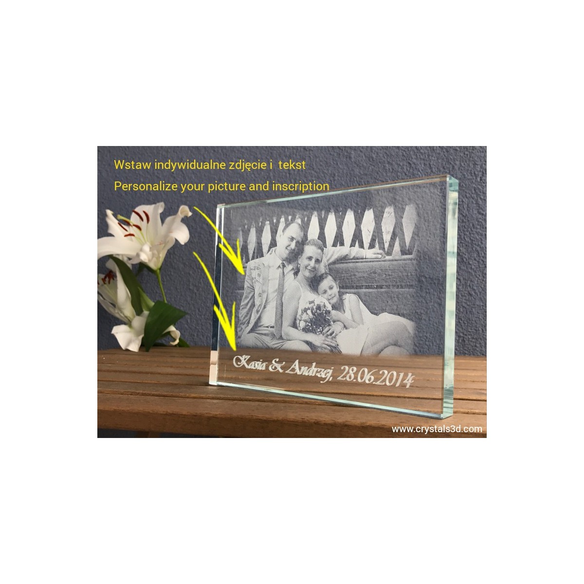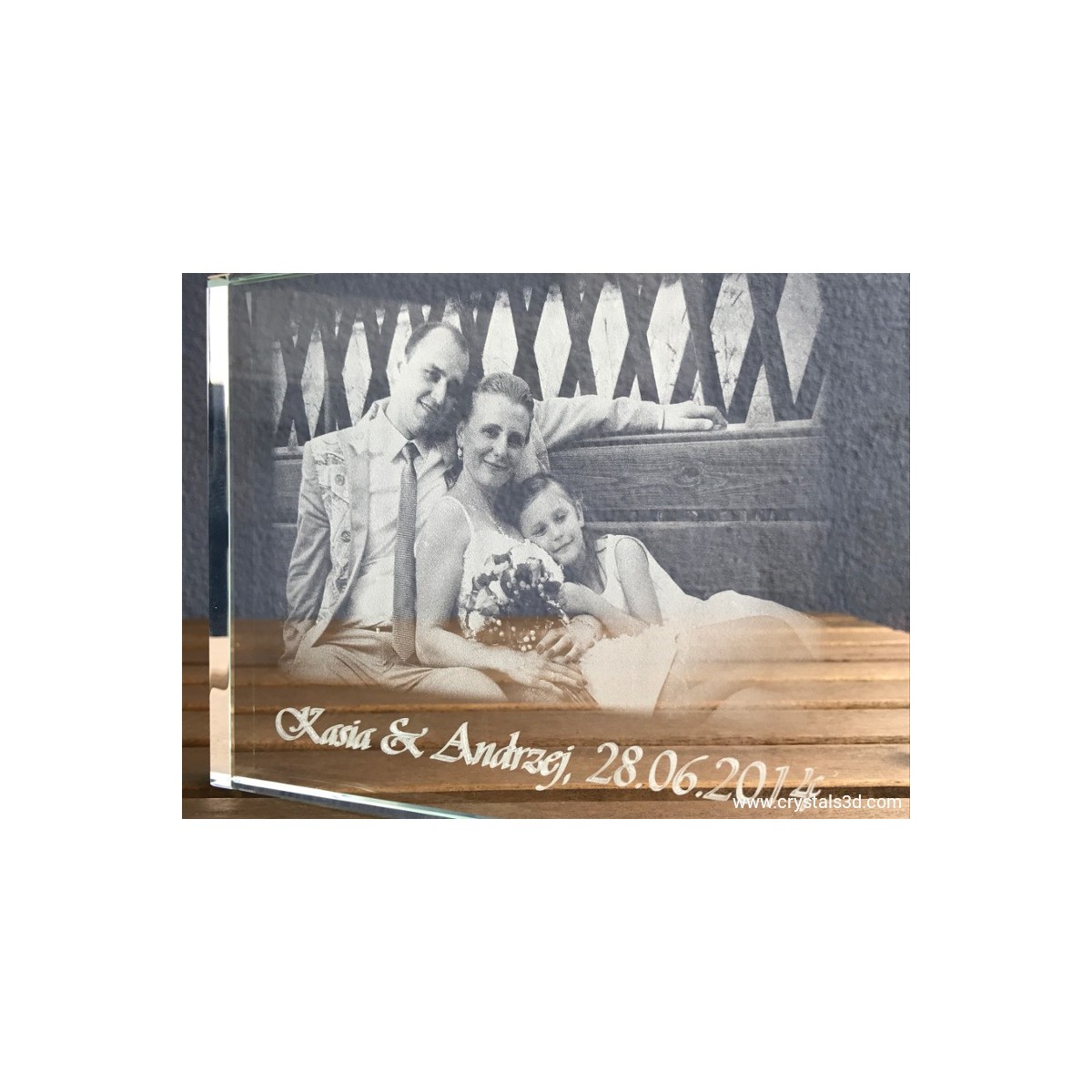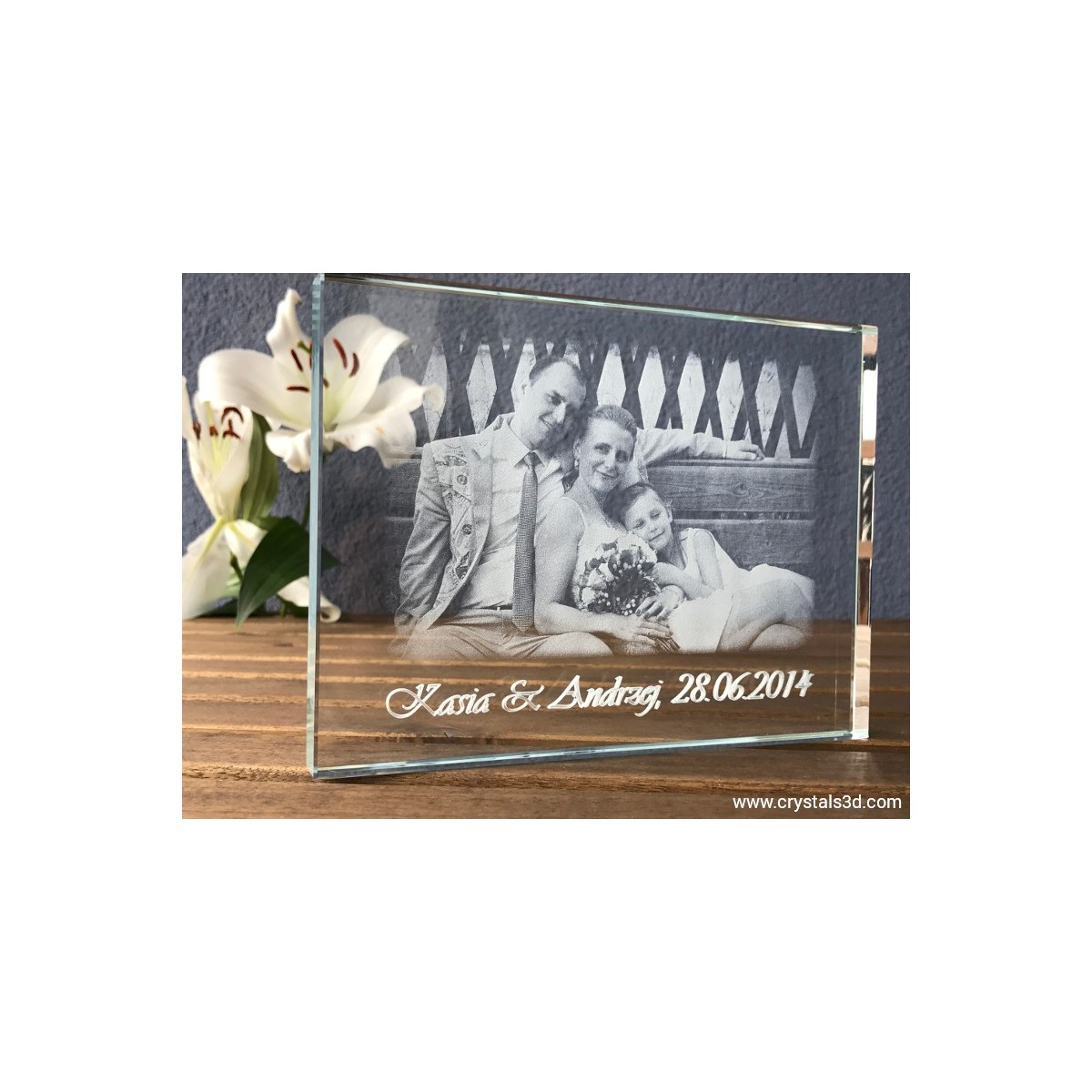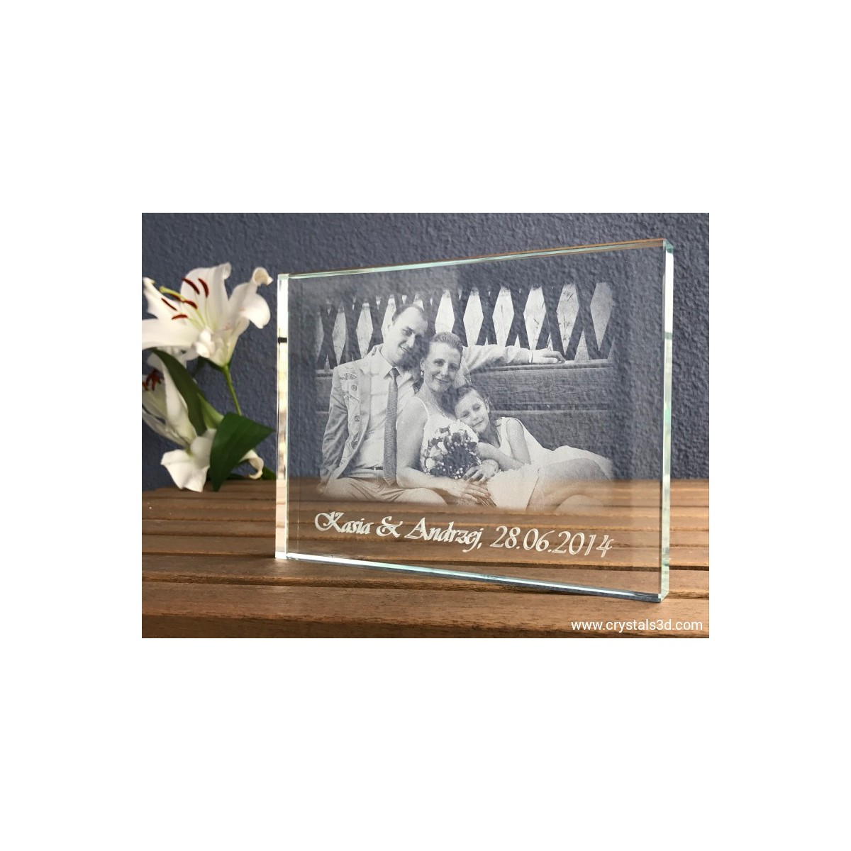 Kryształowa ramka ze zdjęciem ze ślubu lub wesela o wymiarach 20*15*1.9 cm . Jest to idealny pomysł na wyjątkową pamiątkę ślubu dla młodych lub podziękowanie dla rodziców. Proponujemy wygrawerowanie wybranego, szczególnego zdjęcia ze ślubu lub wesela, dodając imiona nowożeńców oraz datę zaślubin. Dodatkowo można projekt personalizować drobnym elementem ozdobnym, np. serduszkami, gołąbkami czy ramką z kwiatów.